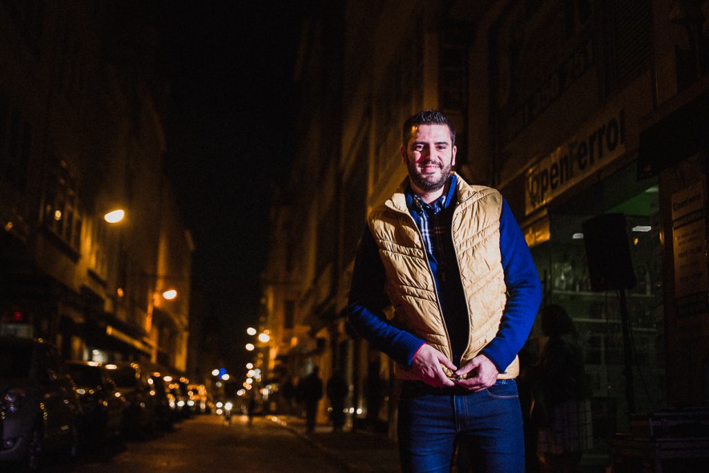 Rubén con sudadera fieltrada de Lois, chaleco para los días más fríos de Slam, y pantalones de Lois.