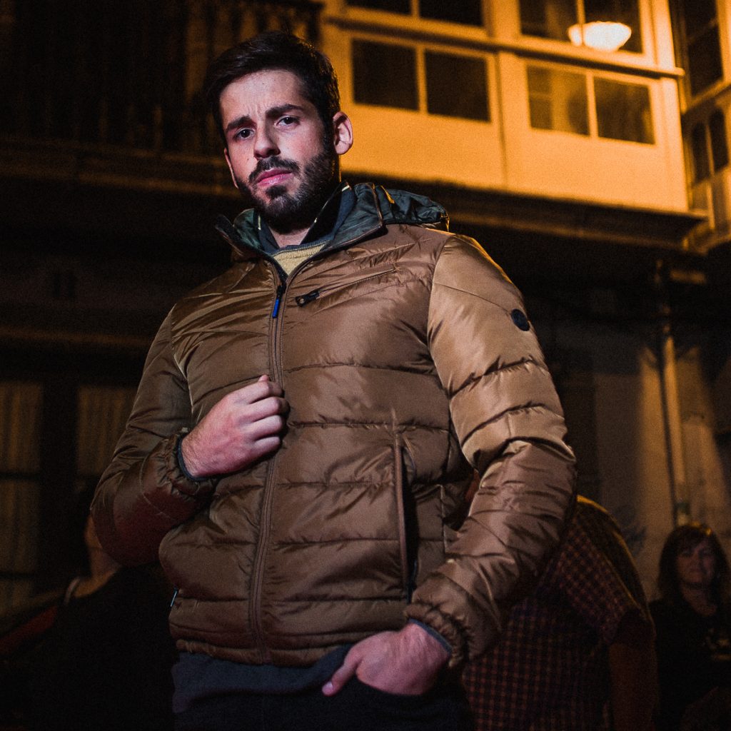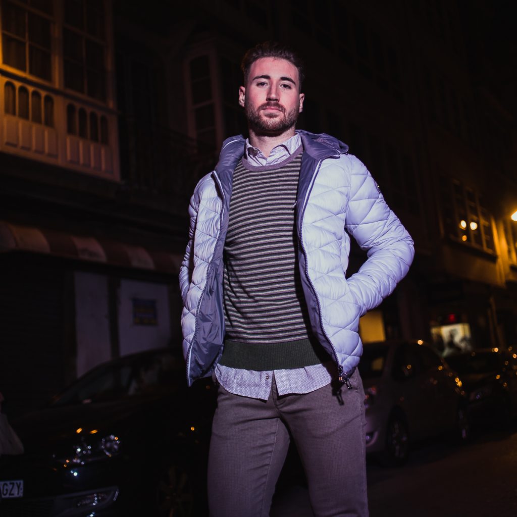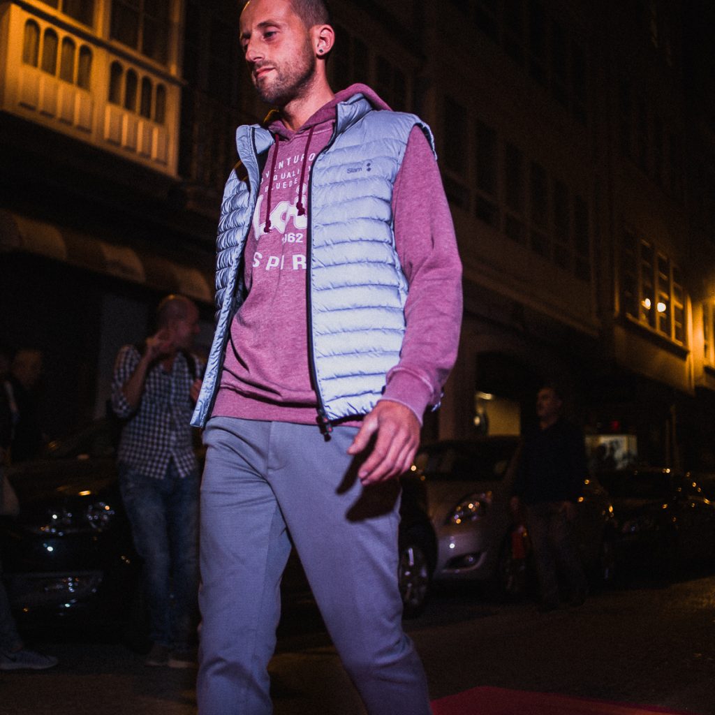 Jhonathan nos mostró lo nuevo de SeaBarrier (prenda de abrigo, jersey de punto y polo). El polo con los cuellos levantados le da un toque más dinámico. Los pantalones son de LoisJeans.